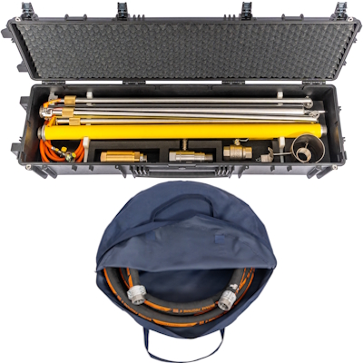 Das Basisgerät bestehend aus dem Standrohr mit standsicherem Dreibein, Absperr- und Prüf-Kugelhahn, 10 m Schlauchleitung und Erdung komplett im hochwertigen Kunststoff-Transportkasten.